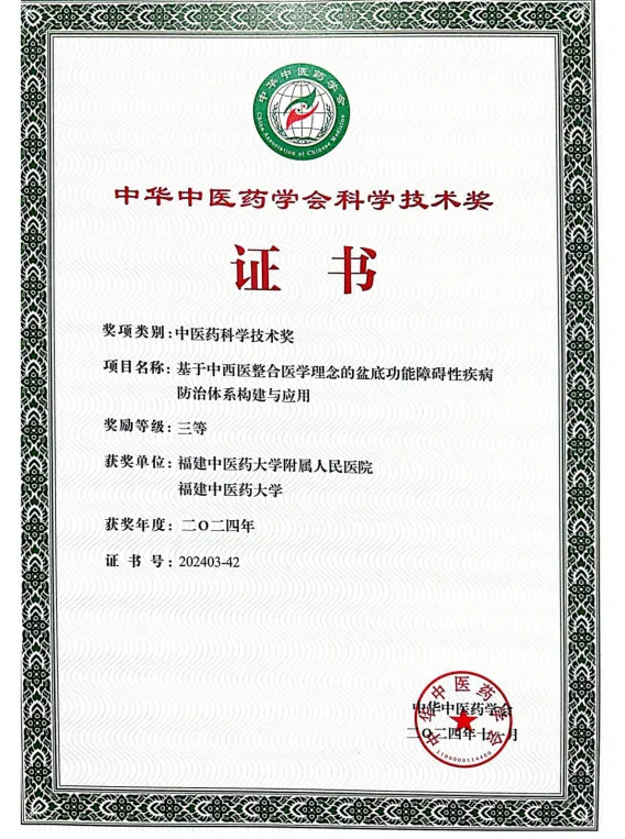近日,2024年度中华中医药学会科学技术奖评审结果公布,福建中医药大学附属人民医院作为第一完成单位、妇科陈捷教授作为第一完成人与福建中医药大学共同完成的科技成果《基于中西医整合医学理念的盆底功能障碍性疾病防治体系构建与应用》喜获三等奖。