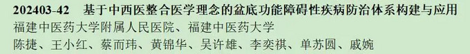陈捷教授带领的整合盆底医学团队致力于探索实践中西医整合盆底综合诊疗新模式,牵头建设的“中医盆底医学中心”于2017年列入福建省政府医疗“创双高”建设项目,2021年率先建立的“妇科微创与整合盆底临床医学研究中心”获批成为福建省第一批临床医学研究中心。此次获奖项目基于中西医整合医学理念构建整合盆底医学中心,深入研究盆底功能障碍性疾病发病机制,同时创新盆底功能障碍性疾病诊疗方案,开展盆腔脏器脱垂、复杂性肛瘘等盆底常见、疑难疾病诊疗研究与优化,构建盆底功能障碍性疾病个性化中西医整合康复管理模式。该项目依托多项国家级、省级、厅级课题,发表多篇研究论文,基于该项目的“整合盆底学”和“盆底康复护理学”是国内首个盆底相关本科课程;参与研发的“女性盆底功能障碍中医康复护理虚拟仿真实验教学”,入选2023年国家级一流本科课程;出版2部专著,其中《整合盆底学》专著荣获2023年第34届华东地区科技出版社优秀科技图书一等奖;率先成立了包含78家省内外医疗机构的整合盆底医学联盟,牵头成立了中国医师协会整合盆底医学专委会、福建省中西医结合学会整合盆底医学专委会;构建的盆底功能障碍性疾病的全周期治疗和规范化诊治标准,在多家省内及省外医院应用,具有一定的创新性和影响力。