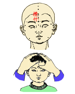1. 用两拇指交替从眉心推向发际