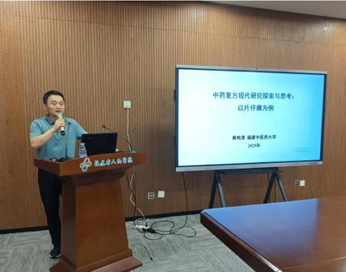 为进一步提升医院中医药科研能力,深化医务人员对中药复方的创新研究认知,8月7日下午,药学部特邀福建中医药大学药学院副院长黄鸣清教授,举办了题为《中药复方科研思路探索与思考:以片仔癀为例》的专题讲座。讲座由药学部江川主任主持,分管科研的副院长陈武进教授出席讲座并致欢迎辞,讲座吸引了医院药学技术人员、科研骨干及临床医师等参与,现场学术氛围浓厚。