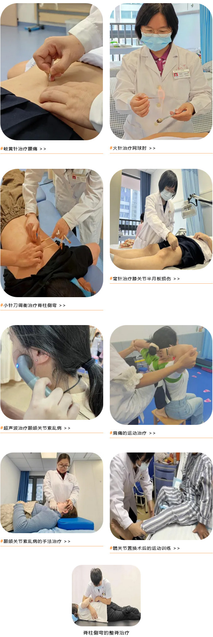 运动康复科致力于以“筋骨并举、阴阳同调”为核心理念,秉承动态平衡调节的治疗思想,将传统针刺疗法(包括普通毫针、岐黄针、小针刀、火针等)与现代康复技术(包括物理治疗、运动训练等)相融合,形成独具特色的中西医结合康复诊疗模式,为各类运动功能障碍患者提供全方位、系统化的康复服务。