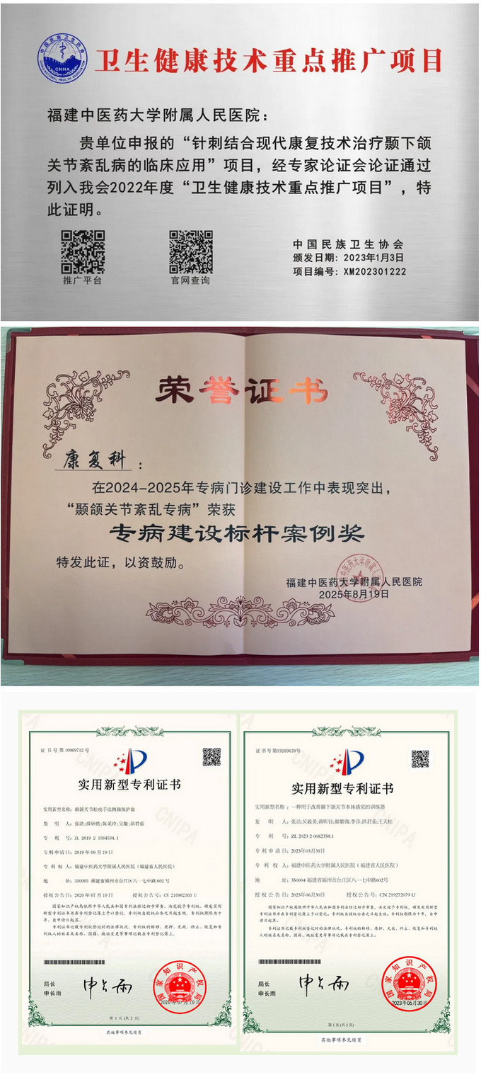 自开诊以来,门诊累计接诊颞颌关节紊乱病患者约13000人次,单次门诊最高接诊量达30人次(实行限号管理)。经过近7年的临床实践与经验总结,门诊将传统针灸与现代康复技术深度融合,逐步构建起以“五体施辨”针刺为特色、结合“4M”现代技术的中西医结合康复诊疗方案。该方案于2022年被中国民族卫生协会纳入“卫生健康技术重点推广项目”,门诊也于2025年8月荣获医院“专病建设标杆案例奖”,同时已成功获批2项实用新型专利。
