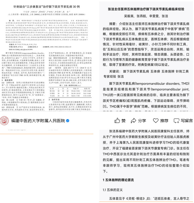颞下颌关节紊乱病属于中医学“痹病”范畴,张洁主任医师以“五体施辨”针刺为特色并与“4M”现代技术相结合的中西医结合康复诊疗方案治疗颞下颌关节紊乱病,针对性采用毫针、岐黄针、小针刀3种不同针刺工具在“五刺以应五体”的思想指导下,灵活运用合谷刺、关刺、输刺手法,并配合中药内服,综合性治疗颞下颌关节紊乱病,同时非常重视全程的口腔行为习惯、头颈姿势、饮食起居、情志调摄等基础健康的教育。