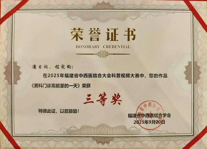 近日,在以“健康中国・中西并重”为主题的福建省中西医结合大会科普视频大赛中,福建中医药大学附属人民医院男科团队凭借扎实的专业素养与创新的科普形式脱颖而出,其创作的科普作品《男科门诊高能量的一天》成功斩获三等奖,为医院中西医结合健康知识普及工作再添亮眼成果。