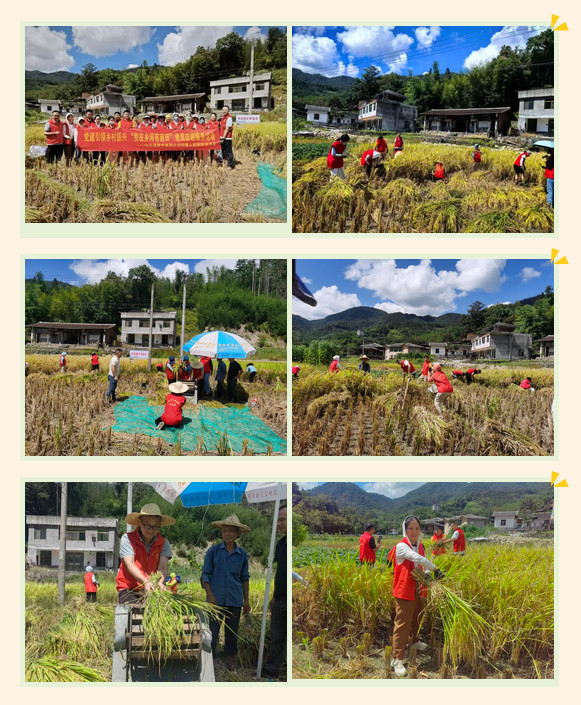 义诊结束后,大家顾不上休息,顶着烈日匆忙赶到认领的稻田边,开展“党建引领乡村振兴‘我在乡间有亩田’”党员志愿服务活动,与当地村民一道迅速投入到热火朝天的秋收中,以实干助力秋收。