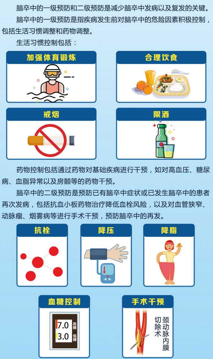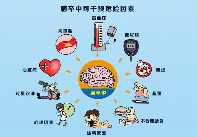 高血压和血脂异常是导致卒中的主要危险因素。超重或肥胖、心脏病(包括心房颤动)、心理因素、吸烟、大量饮酒及糖尿病等也是导致卒中的危险因素。