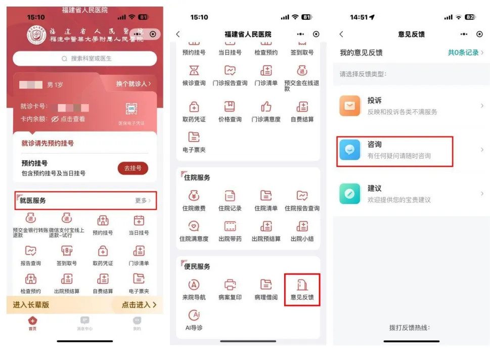 (2)线上留言更便捷:关注“福建省人民医院”微信小程序,进入“就医服务—更多—便民服务—意见反馈”提交您的问题,我们将安排专人及时查看,并尽快通过电话或留言回复您。