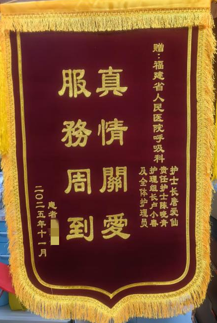 近日,福建中医药大学附属人民医院呼吸与危重症医学科作为医院“免陪照护”病区收到一面绣有“真情关爱 服务周到”的锦旗。这面锦旗,承载的不仅是一份谢意,更是患者及家属对免陪照护病区“由护士进行专业引领,由护理员负责贴心执行”服务模式的高度认可。