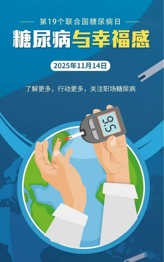 2025年11月14日是第19个联合国糖尿病日。2024至2026年联合国糖尿病日的主题是“糖尿病与幸福感”,提倡不仅仅关注血糖,应当通过适当的糖尿病护理和健康支持,进一步提升糖尿病患者的生活质量,让每位糖尿病患者都有机会享受健康的生活。而今年的口号是——了解更多,行动更多,关注职场糖尿病。