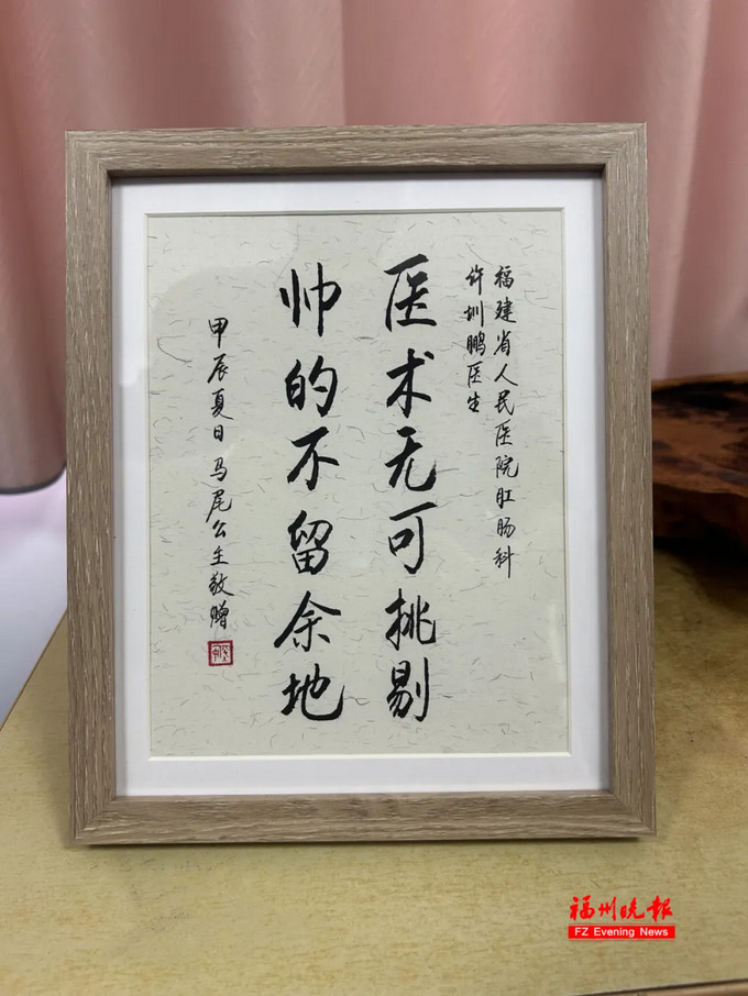 一年前,一名50岁的外地大叔因坏死性筋膜炎导致感染性休克,被平车推入肛肠二科。当时他从臀部到胸部皮肤泛红,底下全是脓液,生命垂危。许圳鹏立即为他手术,从臀部到胸壁开了三四十个切口,彻底切开清创,并对盆腔深处的脓液也进行置管引流。术后,大叔各项指标好转,命保住了。让许圳鹏惊喜的是,一年后,这大叔突然出现在诊室外,说是来福州一定要顺道来看看救命恩人,还带来了家乡的特产。