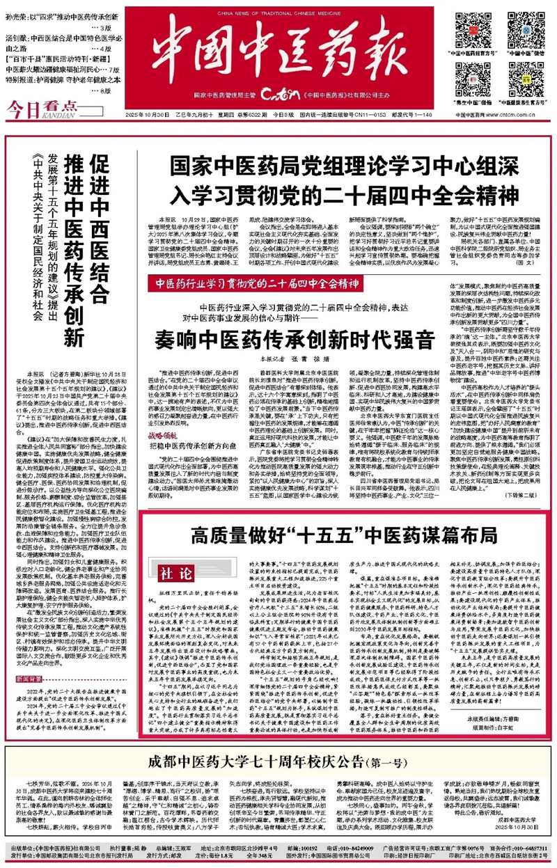 党的二十届四中全会胜利闭幕,会议通过的《中共中央关于制定国民经济和社会发展第十五个五年规划的建议》,准确把握“十五五”时期党和国家事业发展所处历史方位,深入分析我国发展环境面临的深刻复杂变化,对未来五年发展作出顶层设计和战略擘画。其中,《建议》强调“推进中医药传承创新,促进中西医结合”,凸显了党和国家对发展中医药事业的高度重视,也为未来五年中医药发展举旗定向。