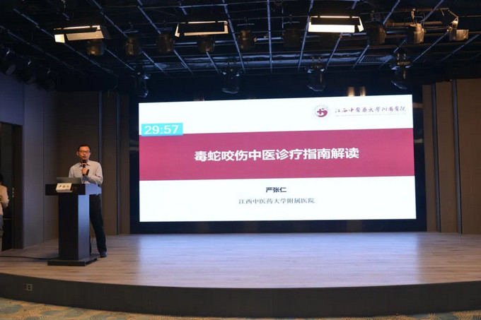 ▲江西中医药大学附属医院严张仁主任医师作《毒蛇咬伤中医诊疗指南解读》专题讲座