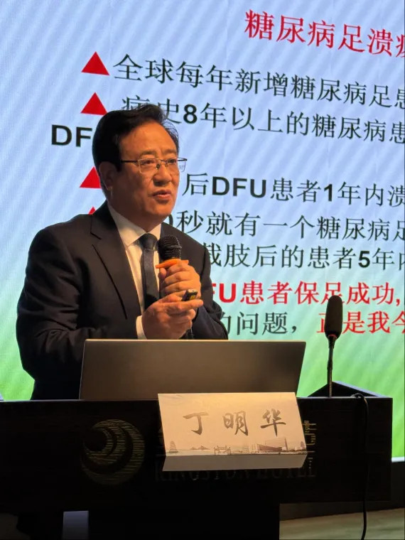 ▲河南大学附属南石医院创面修复中心名誉主任丁明华主任医师作《中西医结合创新治疗糖尿病足溃疡》专题讲座
