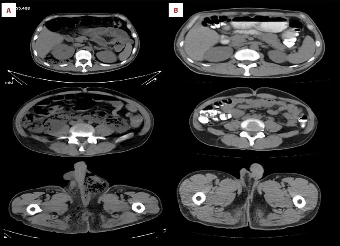 治疗前后影像对比:【A】为术前CT影像,【B】为术后1个月CT复查情况