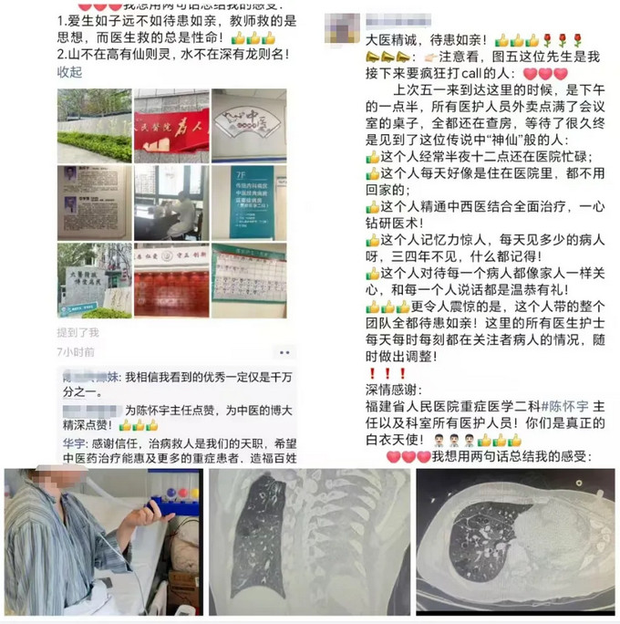 开科伊始,病人有疑虑。一位心包结核术后老太太,膈肌几乎瘫痪无法脱离呼吸机,陈怀宇用温阳、益气健脾的中药调理,搭配康复科协同,从脱机半小时逐步增至9小时,最终助老人走着出院。一位左肺毁损合并慢性心衰急性加重的患者,时隔五年再次在陈怀宇的诊疗下痊愈出院。患者家属在朋友圈写道:“这个人经常半夜十二点还在医院忙碌;这个人每天好像是住在医院里都不用回家;这个人精通中西医结合全面治疗;这个人对待每一个病人都像家人一样关心,和每一个人说话都是温恭有礼……”