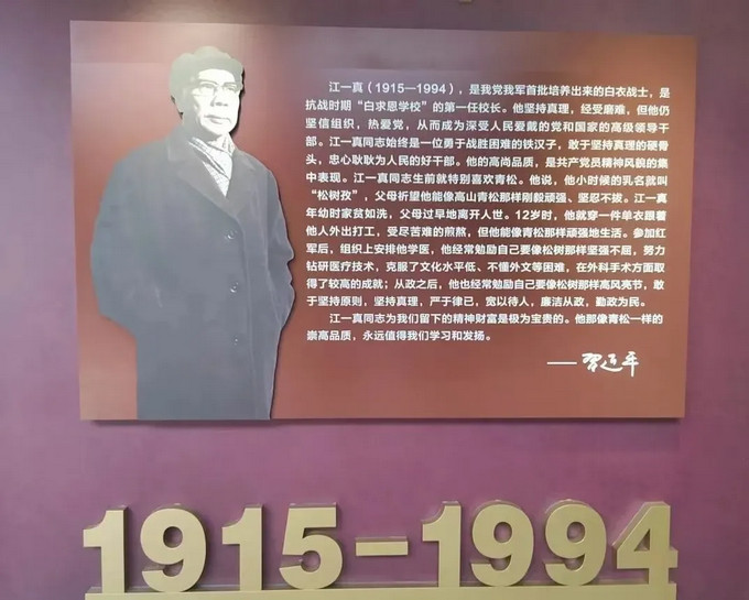 江一真(1915-1994),福建连城人。1929年参加中国工农红军,1934年加入中国共产党。参加了中央革命根据地一到五次反“围剿”斗争,1934年参加中国工农红军长征。历任红军师卫生队队长,中央红军总收容队医疗队队长,中央红军总医院医务主任,红军重伤医院院长,八路军野战医院院长,晋察冀军区卫生学校校长,白求恩卫生学校校长,晋察冀军区卫生部部长,新四军滨海总队政委兼滨海县委书记,华中工委土改工作队队长兼党委书记,泰州地委副书记。