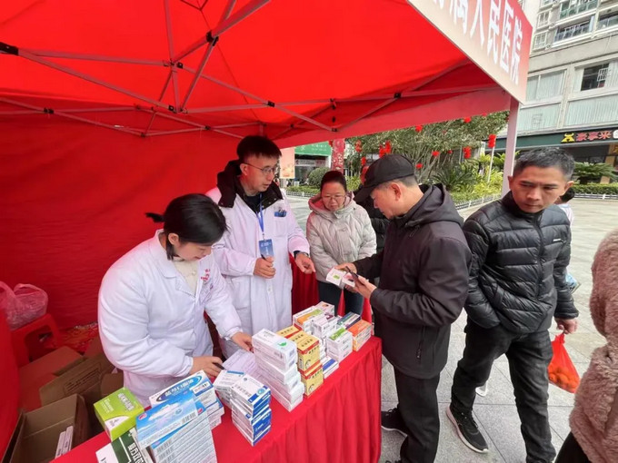 用药咨询台前,主任药师陈成辉详细解答群众关于药品用法、副作用及注意事项的各类问题,并免费发放了一批家庭常备药和慢性病基础用药,引导群众安全、合理用药。