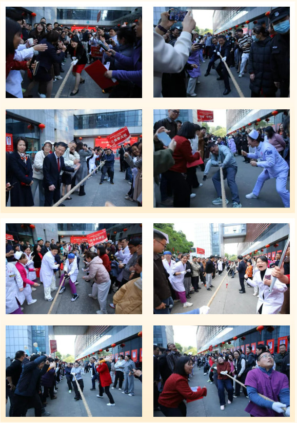 表彰大会结束后,“迎新春喜乐汇”活力开启!由李翠云主任、陈榕主管护师领唱的《好日子》唱响幸福序曲;机器人舞蹈互动表演与护理团队劲舞《第一天》引爆青春能量;林柏熹、郑春盛主任等带来的《好运来》将现场氛围推向高潮。“凝心聚合力,马年启新程”职工拔河比赛在欢快的旋律中燃情开幕!