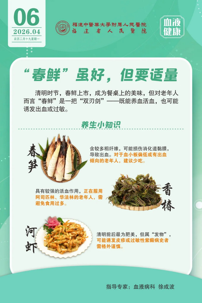 健康日历 | “春鲜”虽好但别贪!血液病科专家提醒:这几类老人吃错可能诱发出血!