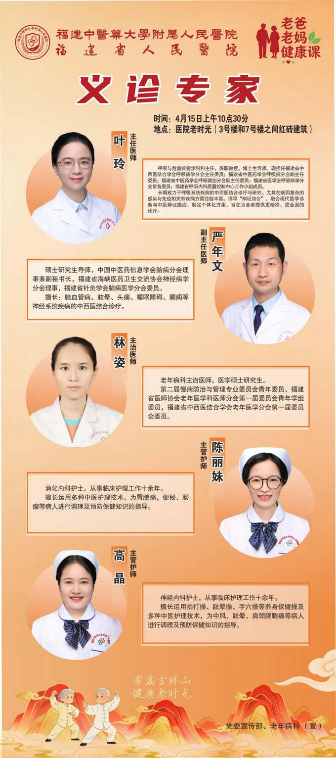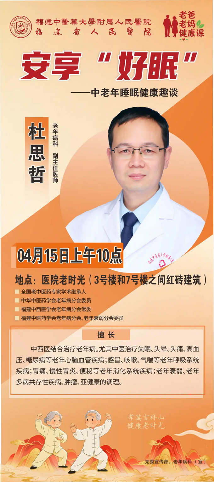 4月15日(周三),福建中医药大学附属人民医院(以下简称:省人民医院)和福州晚报携手举办的“老爸老妈健康课”第二课开讲,将帮您打破失眠的恶性循环,并带来义诊和形式丰富的健康互动。