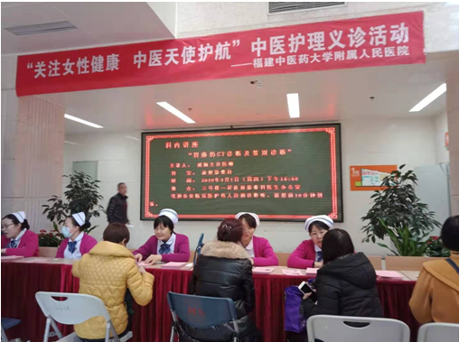 2019年3月8日上午,由福建中医药大学附属人民医院护理部选派的中医护理专家及护理志愿者在医院进行义诊活动。活动分为大型义诊活动和中医护理门诊健康大讲堂两项。此次活动旨在针对女性常见的疾病大力宣传及健康卫生知识,倡导健康生活方式,增强妇女身心健康,强化自我检测和防范保健意识,唤起社会各界对女性健康的关注,让更多女性朋友在此次活动中得到真正的关爱和帮助。