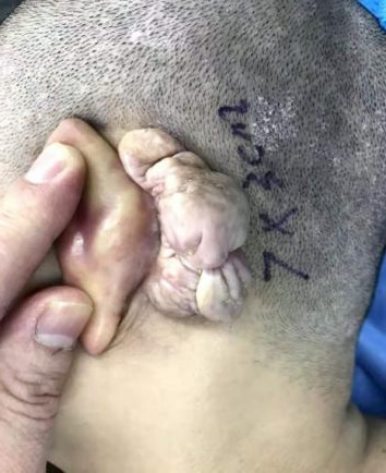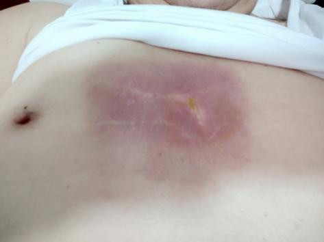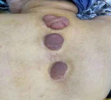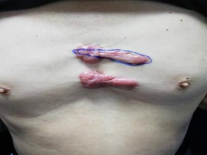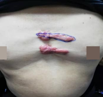 患者陈某,60岁,胸部瘢痕疙瘩增生35年,时常自觉瘙痒,衣物摩擦可有触痛不适,曾自己尝试通过网络途径购买多种价格高昂“祛疤药物”治疗,疤痕不仅没有得到缓解,反而进行性增生加重。遂就诊多家医疗机构先后进行注射、切除等多种诊疗,但瘢痕疙瘩反而增生较前更大。后经人介绍来到福建省人民医院皮肤科,经详细检查后,王斗训副主任医师团队最终制定了中西医结合的诊疗方案:先行手术切除瘢痕疙瘩组织,创面拆线后行浅层放疗SRT-100,后期配合内服桃仁、藏红花、浙贝母、昆布等活血化瘀、软坚散结方剂,外用专科制剂“积雪草油”按摩、穴位封闭、协定方中药熏蒸、火针等,内外联合,标本兼顾。治疗1年后复查,瘢痕未再增生,患者对疗效非常满意。