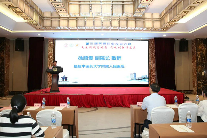 福建中医药大学附属人民医院副院长徐顺贵代表主办方致辞,他表示,希望这次会议能为大家提供一个学习交流的平台,通过对医师职业发展的交流和探讨,进一步促进医学人文学科交流、助力医学人才培养和青年医师成长。