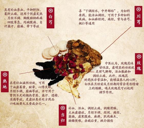 玫瑰花适量,当归三两、白芍五两、熟地二两、川穹一两、红枣二两。