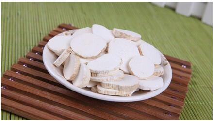 【性状】本品为类圆形、椭圆形或不规则的厚片。表面类白色或淡黄白色,质脆,易折断,切面类白色,富粉性。气 微,味淡、微酸,嚼之发黏。