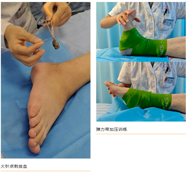 患者就诊后,首先进行全面的医学评估,结合体格与影像学检查,明确损伤部位与程度。在遵循急性损伤的“POLICE”原则下,采用中医特色的火针点刺放血疗法,以快速祛瘀消肿。同时,指导患者在无痛范围内做踝泵训练及弹力带加压训练,加速踝关节的康复进程。