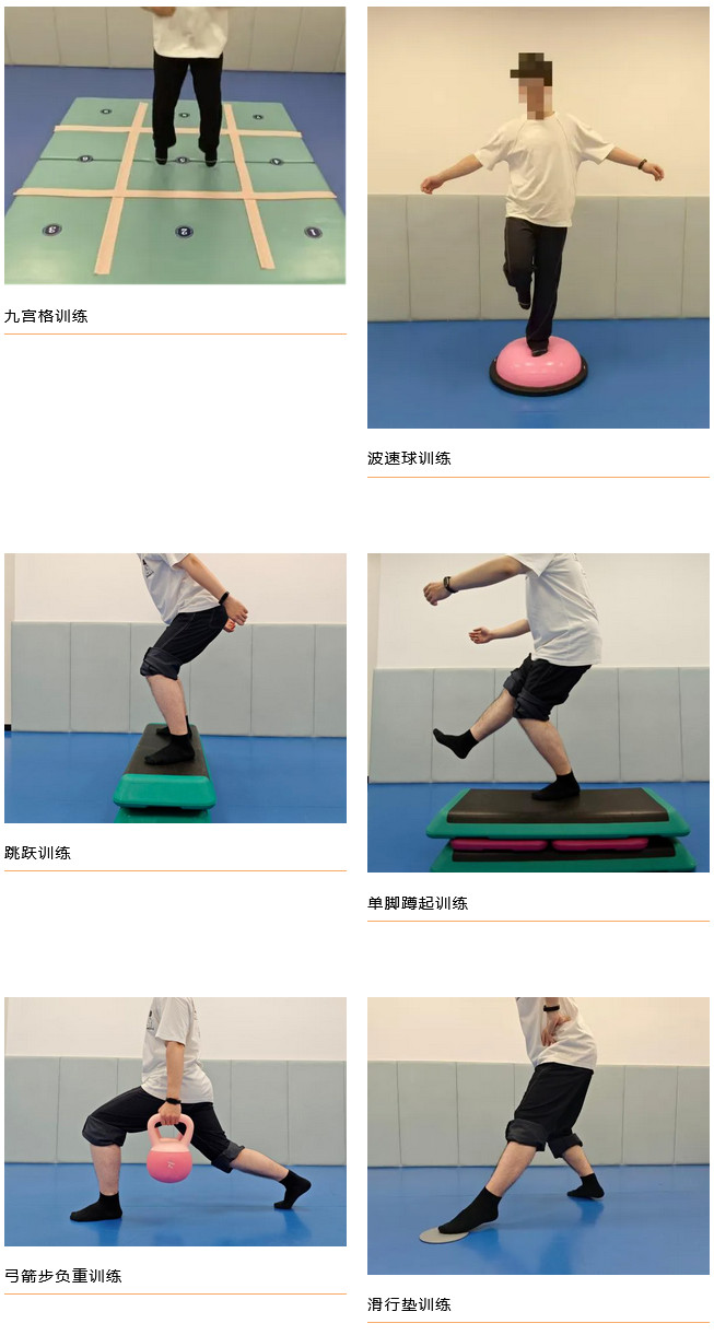 本体感觉及平衡功能训练:闭眼站立挑战、跳九宫格、滑行垫训练等;